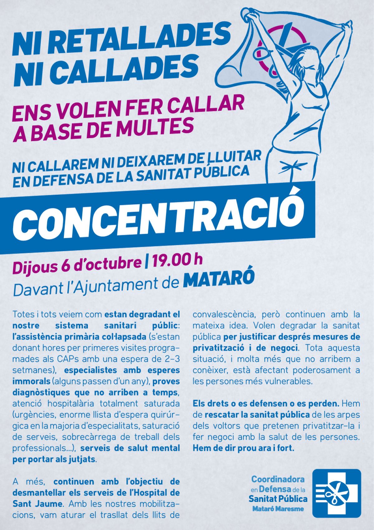 CatalunyaPress.- La Coordinadora en Defensa de la Sanitat Pública de Mataró i Maresme ha convocado una concentración delante del Ayuntamiento de Mataró (Barcelona) este jueves 6 de octubre a las 19.00 horas. El motivo: protestar contra la “degradación” del sistema sanitario público. El alcalde de Mataró es David Bote, del PSC.