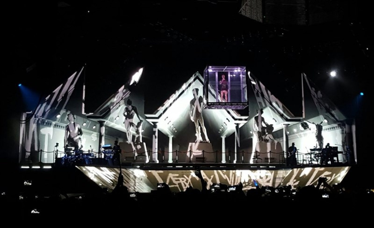 "Llevamos muchos conciertos y estamos muy lejos de casa. ¡Estamos muy agradecidos de teneros aquí", ha explicado el cantante antes de que una enorme plataforma con una megacama elástica apareciera de la nada sobre las cabezas del público y dando más de un salto mortal sobre ésta saltara con 'Company' con todo su cuerpo de baile.