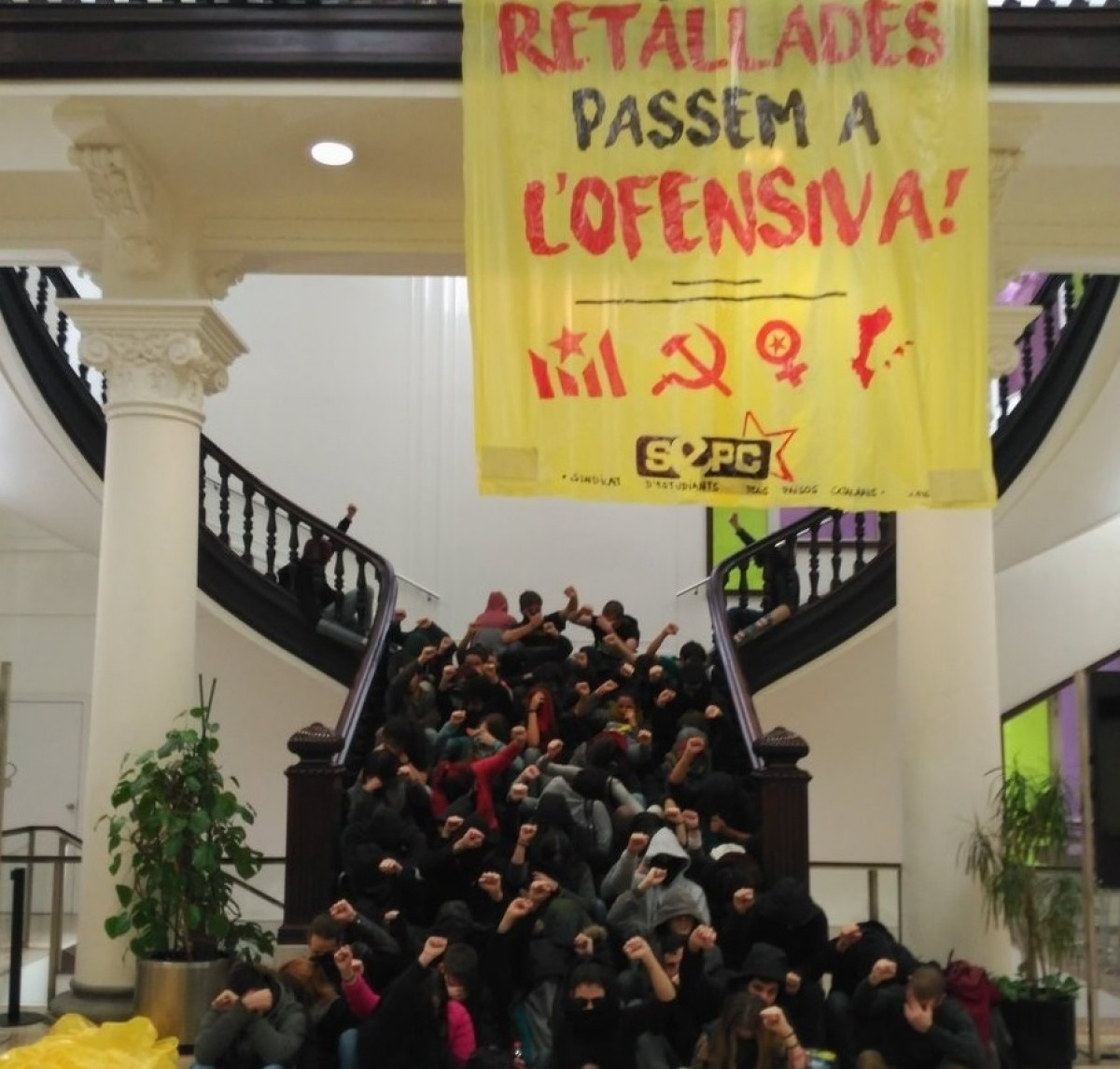 Durante el encierro colgaron una pancarta en el interior del edificio con el mensaje 'Revirtamos los recortes. Pasemos a la ofensiva' y publicaron imágenes en las redes sociales de destrozos en despachos, entre ellos el del secretario general, Arcadi Navarro.
