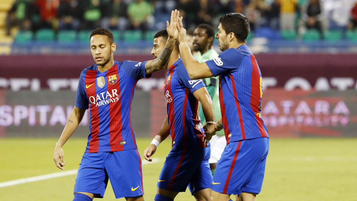 Un amistoso en plena temporada para cumplir con un activo del acuerdo de patrocinio de Qatar. Un partido que poca gracia le haría a Luis Enrique Martínez pero éste cumplió con lo pactado y el tridente salió de inicio, puso intensidad, magia y tres goles -uno para cada uno- y a la media hora se fue a descansar. Solo hubo un posible lesionado, el canterano Carles Aleñá, y el equipo se engrasó de cara al derbi contra el RCD Espanyol del domingo.