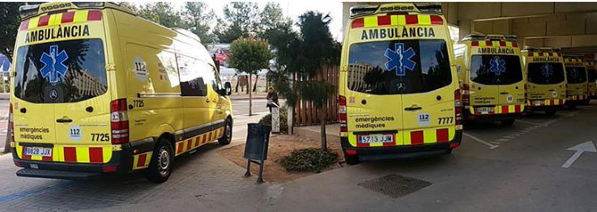 Debido al colapso del servicio, el parking de transporte sanitario de este Hospital ubicado en Sant Joan Despí se queda pequeño un día tras otro y las ambulancias tienen que estar ocupando la acera con enfermos en sus vehículos para ser transferidos al servicio de Urgencias.