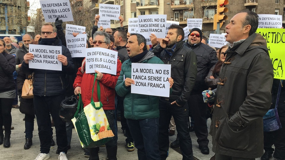 Los manifestantes han protestado con pitos y pidiendo la dimisión del conseller de Justicia, Carles Mundó, y han exhibido pancartas con consignas como "en defensa de todos los puestos de trabajo" y reclamando la apertura del centro de preventivos de la Zona Franca.