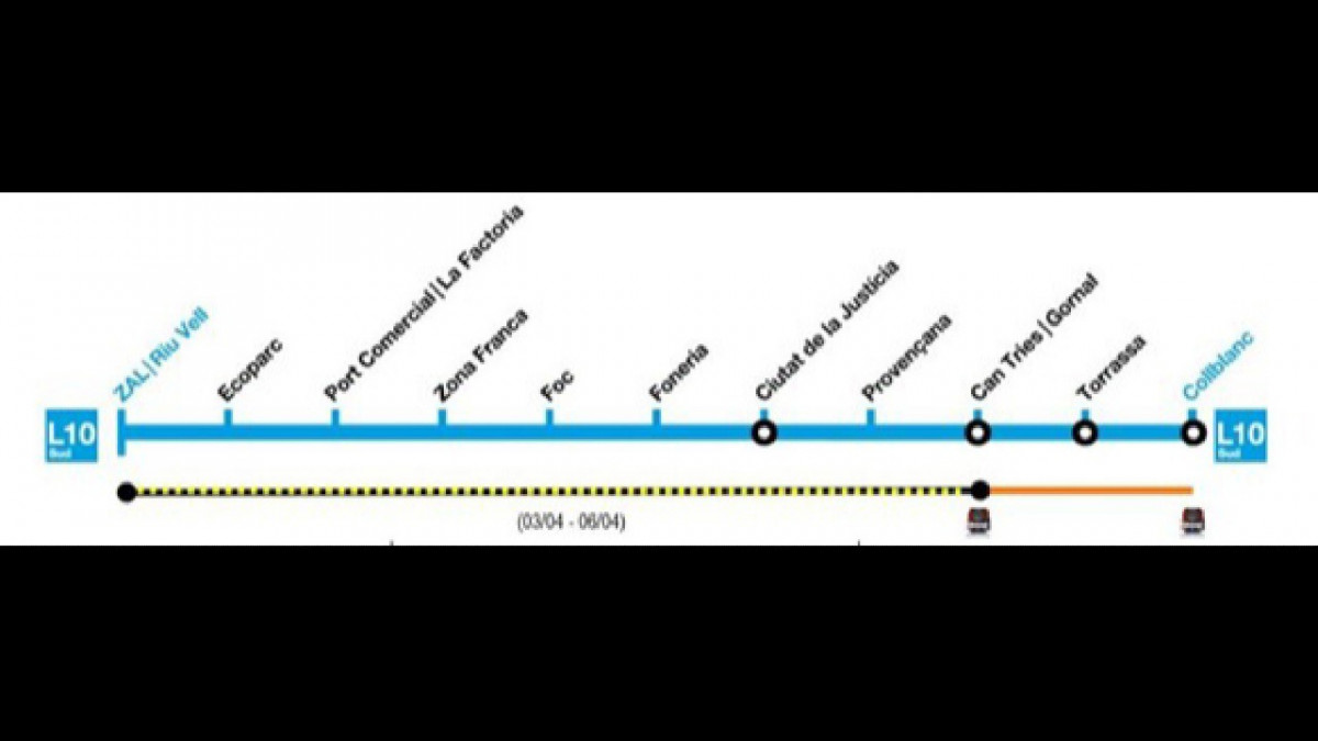 La L10 Sud del Metro de Barcelona quedará cerrada entre las estaciones de ZAL/Riu Vell y Can Tries/Gornal a partir del 3 de abril y hasta el 6 de abril, coincidiendo con Semana Santa, por los trabajos de mejora que ejecutará el Departamento de Territorio, Vivienda y Transición Ecológica de la Generalitat.