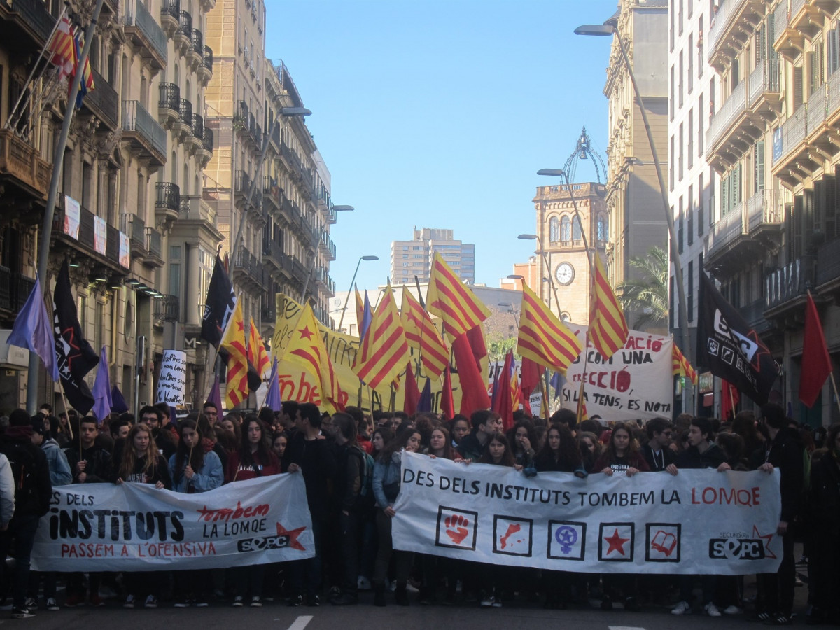 La manifestación, bajo el lema 'Des dels instituts tombem la Lomqe' (Desde los institutos tumbemos la Lomce), ha transcurrido desde la plaza Universitat hasta la plaza Sant Jaume recorriendo el lateral de la Rambla y la calle Ferran.