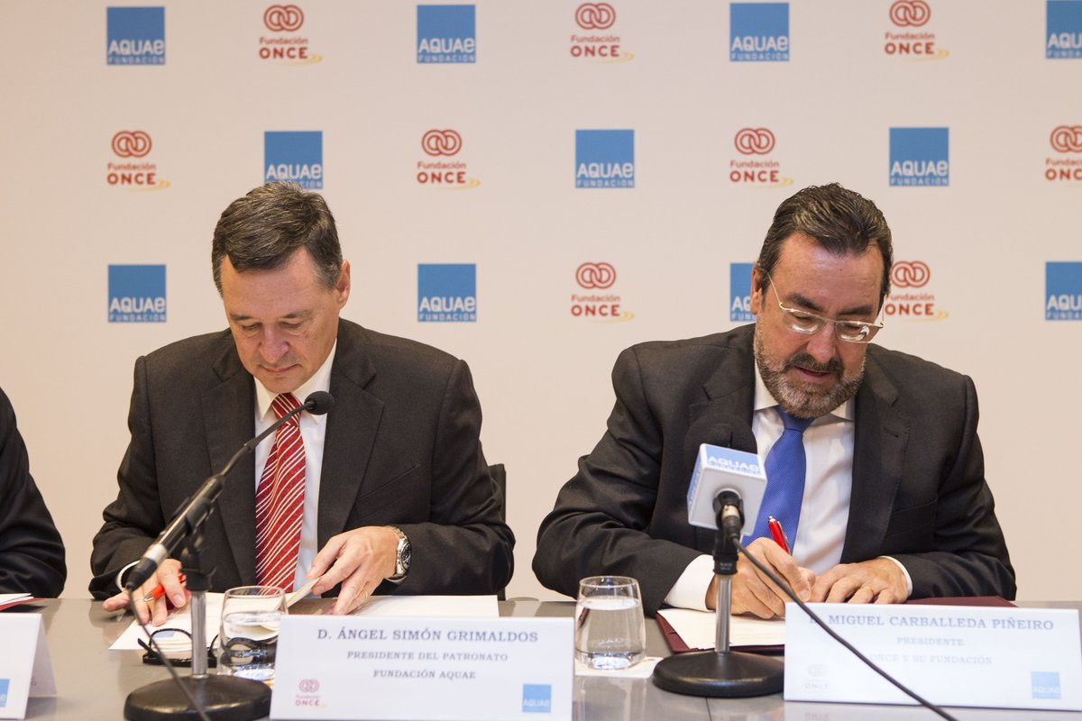 El presidente de la ONCE y su Fundación, Miguel Carballeda, y el presidente de la Fundación AQUAE, Ángel Simón, han sido los encargados de firmar el acuerdo en un acto que también contó con la presencia de Alberto Durán, vicepresidente ejecutivo de Fundación ONCE.