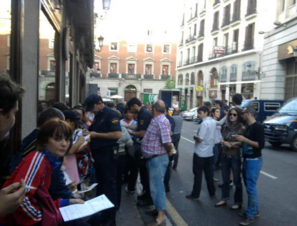 Esta acción simbólica puesta en marcha por los 'indignados' se está llevando a cabo de forma organizada. Los clientes están accediendo de dos en dos en la oficina, mientras policías antidisturbios llaman al orden en la calle y solicitan a los congregados que se identifiquen..