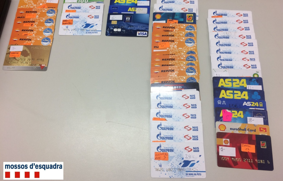 Los Mossos d'Esquadra han detenido a dos hombres de 28 años como presuntos autores de un delito de estafa bancaria y falsificación, por haber hecho pagos en gasolineras y peajes con tarjetas falsificadas, según ha informado este domingo el cuerpo en un comunicado.