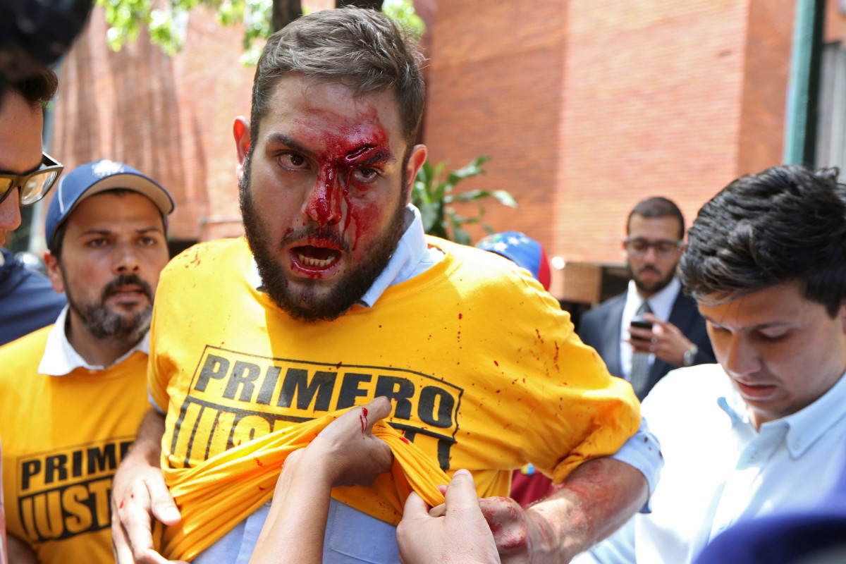 El joven diputado Juan Requesens fue herido en la cara y le tuvieron que poner 56 suturas en la frente. El diputado José Guerra se desmayó por los gases lacrimógenos y pimienta. A Juan Guaidó le fracturaron el brazo derecho. El tenor venezolano Victor López, ganador del Premio Pavarotti, también fue herido en la cabeza.