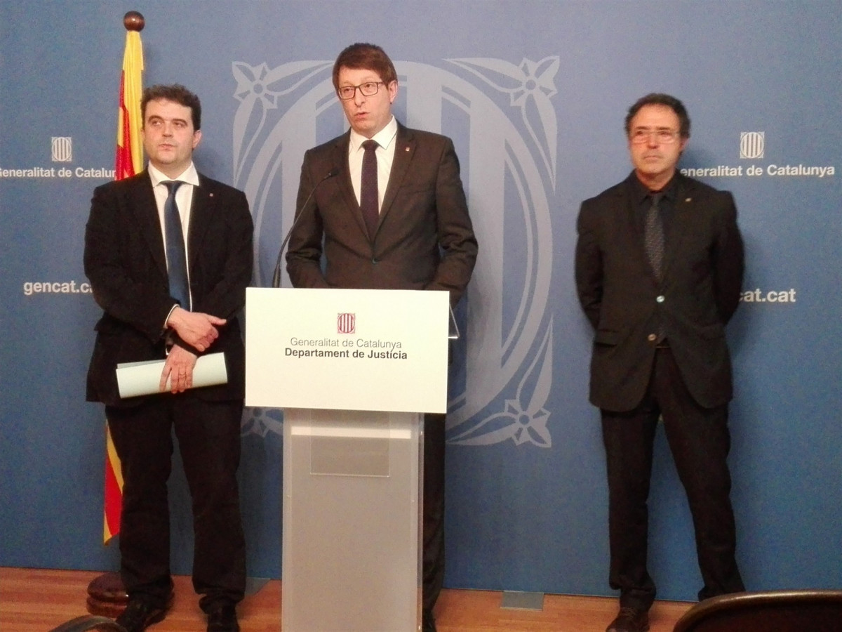 Pere Lluís Huguet, expresidente del Consejo de la Abogacía Catalana; Eloy Moreno, de la sección de derecho procesal del Colegio de la Abogacía de Barcelona (Icab) y el abogado Manuel Piñol han sido los encargados de entregarle el documento a Mundó en la Conselleria, y le han dicho que no defienden una posición partidista sino unos principios en los que coinciden todos los firmantes.