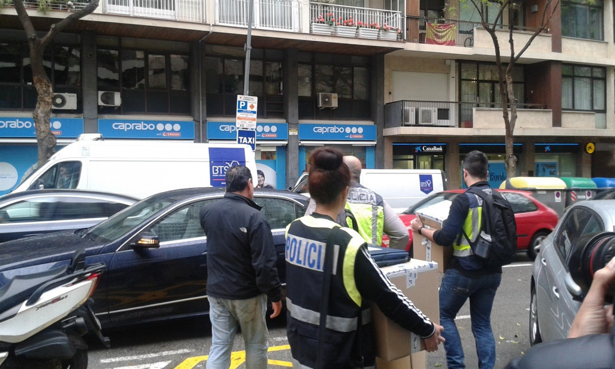 Paralelamente, un coche policial sin logotipar y con los vidrios traseros tintados ha entrado en el parking del edificio, y el vehículo ha salido poco después. Una vez los agentes se han llevado las cajas y el coche ha salido del aparcamiento, los agentes que custodiaban el edificio también se han retirado.