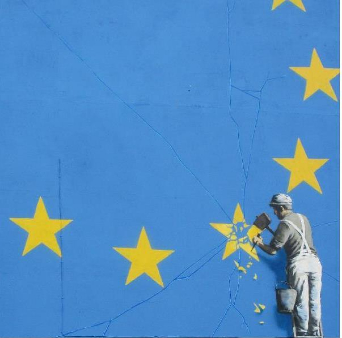 Su cuenta de Instagram confirmó la autoría de su primer mural inspirado en el Brexit. El pintor ha plasmado sobre el lateral de un edificio el símbolo de la Unión Europea. A simple vista no le sucede nada, pero hay un pintor subido a una escalera haciéndole los últimos retoques. Con un martillo pica y escarpa una de las doce estrellas: la del Reino Unido.