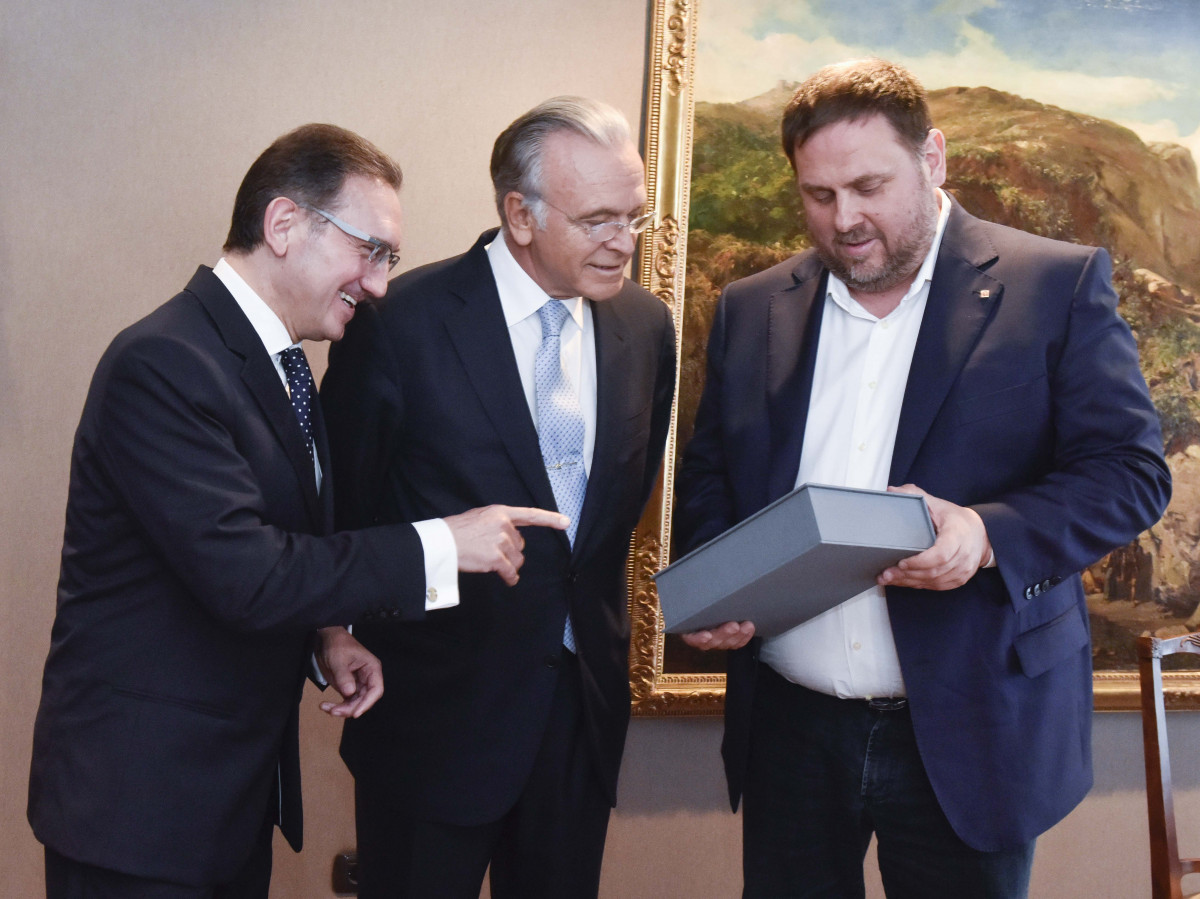 El vicepresidente del Govern, Oriol Junqueras, y el presidente de la Fundación Bancaria La Caixa, Isidre Fainé, han firmado este viernes el convenio marco en la Conselleria, acompañados del secretario de Economía, Pere Aragonès, y el director de la fundación, Jaume Giró.
