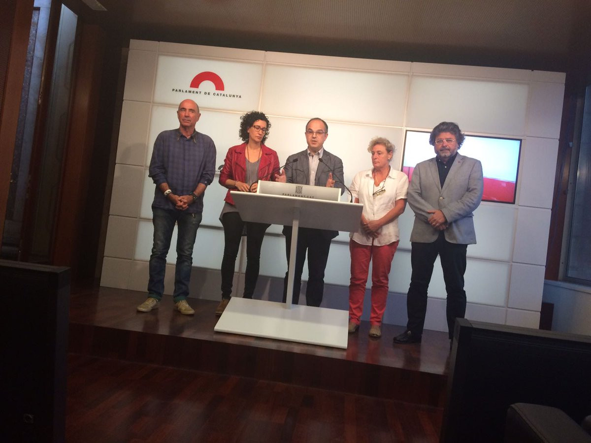 Turull ha comparecido en rueda de prensa acompañado por otros miembros de la dirección del grupo: la portavoz Marta Rovira (ERC) y los diputados Toni Castellà (Demòcrates), Magda Casamitjana (MES) y Lluís Llach (JxSí).