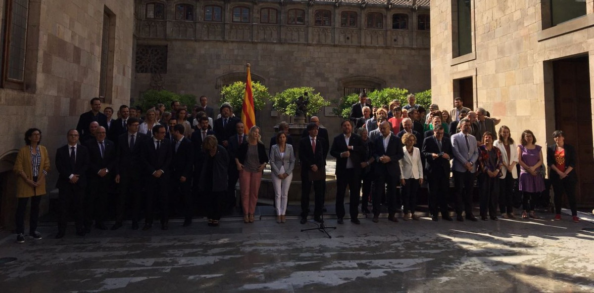 La puesta en escena que ha dispuesto la Generalitat para el anuncio ha sido la de un presidente arropado a derecha e izquierda por los miembros de su Govern y por los diputados de JxSí y la CUP que forman la mayoría independentista del Parlament con 71 diputados de 135.