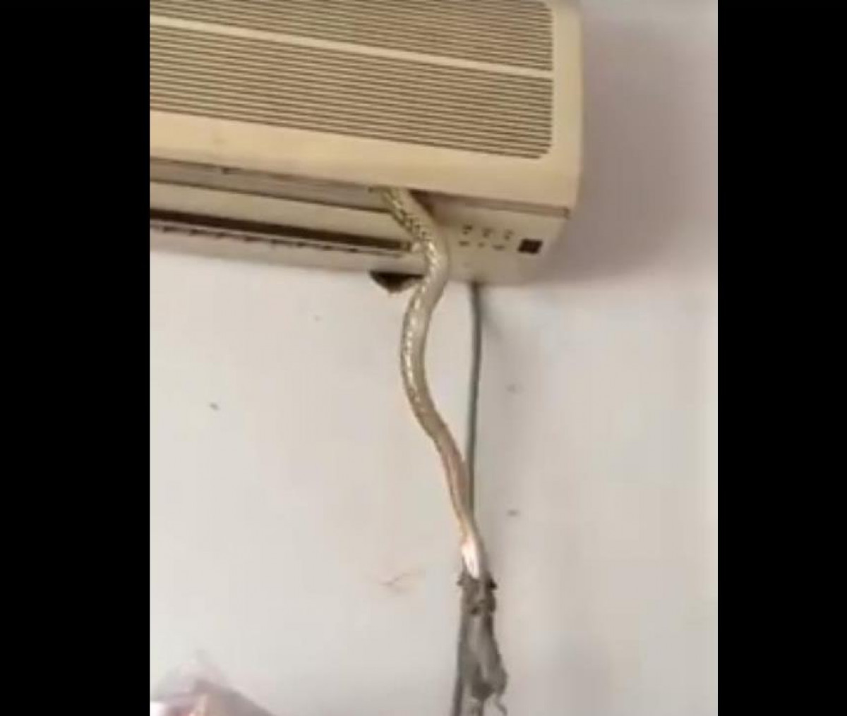 Lo nunca visto: una serpiente sale de un aire acondicionado, se desliza de abajo arriba para capturar a una rata que medoreadaba por una casa de una familia india. Sin duda, un hogar que podría parecer un zoológico.