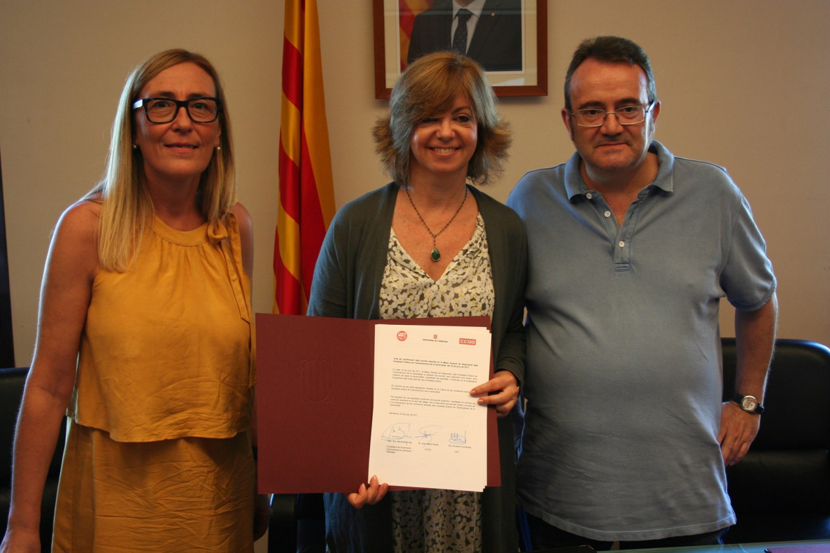 La reunión ha tenido lugar en la Conselleria de Gobernación, Administraciones Públicas y Vivienda, y se ha formalizado con la firma de la titular del departamento, Meritxell Borràs; la secretaria general de la Federación de Empleados y Empleadas de los Servicios Públicos de la UGT de Catalunya, Encarna Fernández, y el coordinador del área pública de CC.OO., Joan Maria Sentís.