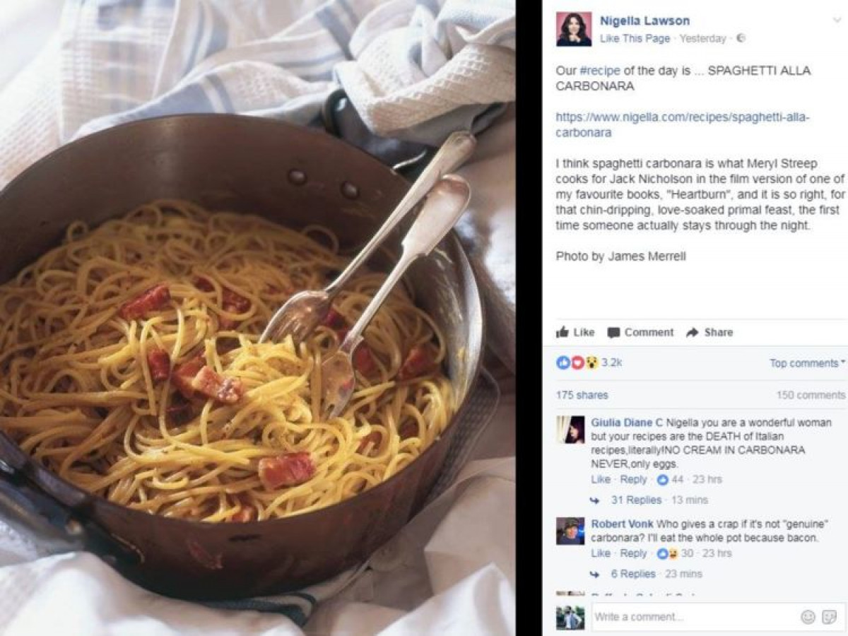 No es la primera vez que un conocido chef británico cambia un plato mediterráneo, causando el enfado de los nativos. Esta vez, la televisiva chef Nigella Lawson (que dirige un programa de cocina) quiso hacer pasta carbonara y compartir su particular receta con sus seguidores. El problema apareció cuando añadió crema a la salsa.