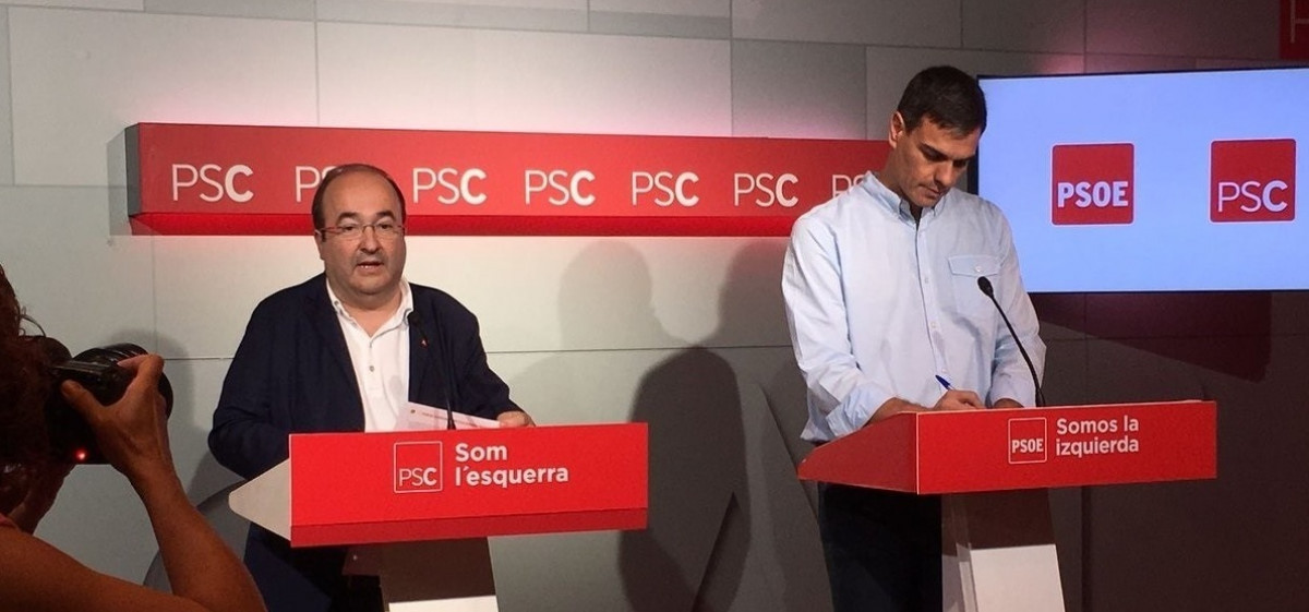 Lo han detallado en rueda de prensa el secretario general del PSOE, Pedro Sánchez, y el primer secretario del PSC, Miquel Iceta, tras encabezar una reunión de las direcciones de ambos partidos en la sede de los socialistas catalanes para sellar el documento de propuestas que se llevaba gestando varias semanas.