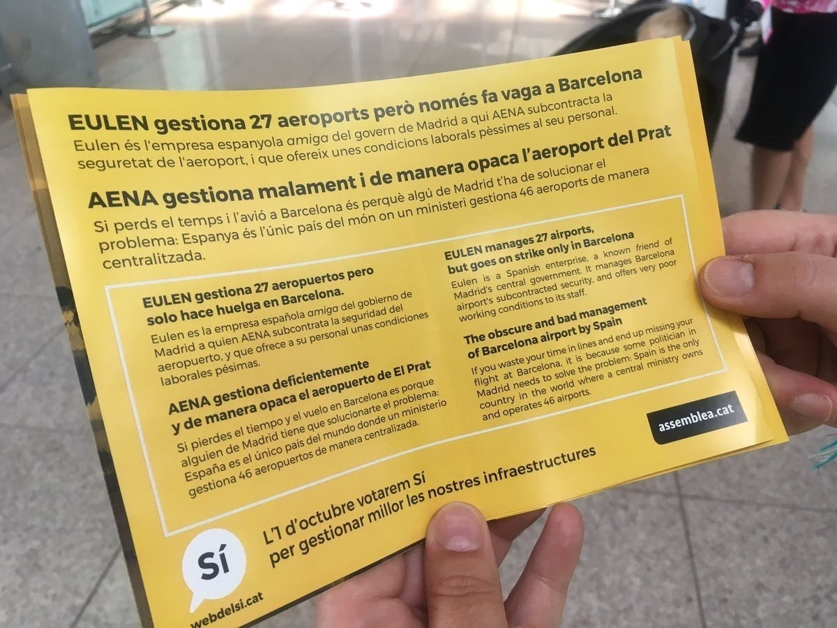 En los folletos, la ANC explica que Eulen gestiona 27 aeropuertos "pero solo hace huelga en Barcelona", y considera que se trata de una empresa española amiga del Gobierno que ofrece unas condiciones laborales pésimas a su personal.