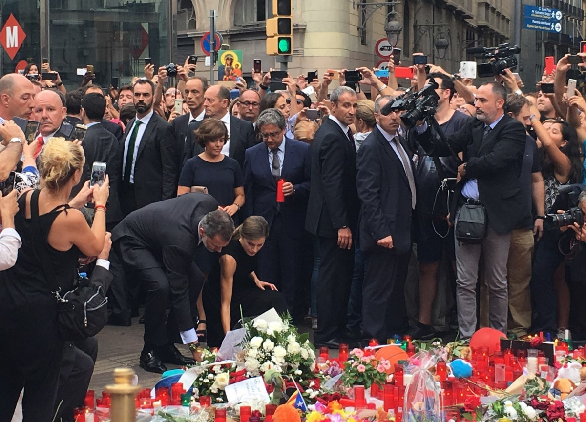 Don Felipe y Doña Letizia han puesto un ramo de flores y después cada uno de ellos han puesto una vela cada uno: los Reyes, el presidente Carles Puigdemont; la alcaldesa Ada Colau; la vicepresidenta del Gobierno, Soraya Sáenz de Santamaría, y el delegado del Gobierno, Enric Millo.