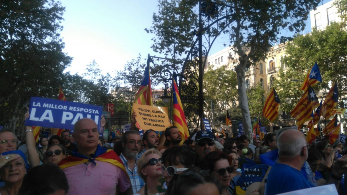 El lema unitario ‘No tinc por’, se ha combinado con protestas por la venta de armas y la relación con países como Arabia Saudí, y con la exhibición de símbolos independentistas que se han expresado en forma de abucheos al Rey y a Rajoy.