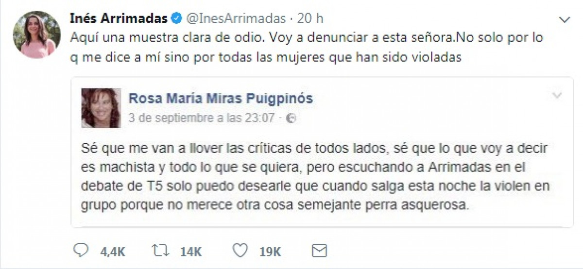 "Voy a denunciar a esta señora. No solo por lo que me dice a mí, sino por todas las mujeres que han sido violadas", ha añadido la líder de Cs en su 'tuit'.