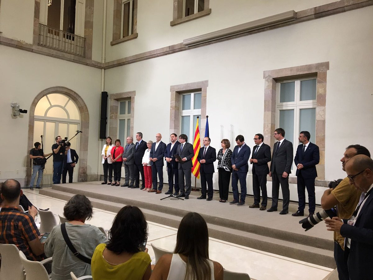 La penúltima acción se producía minutos después cuando el gobierno en pleno firmaba la convocatoria del 1-O. Lo que significa que estarán todos imputados y Oriol Junqueras, como los ciclistas, se ha apeado de la carrera para presidir la Generalitat de Catalunya. Un suicidio político que le va a costar muy caro en sus aspiraciones ya que Puigdemont, hace ya algún tiempo que mostró su intención de no concurrir a las elecciones como candidato por el ¿PDeCAT? Su objetivo es doble: pasar a la historia por su decisión de seguir adelante con el referéndum y desgastar/quitar de en medio a Junqueras, que según todas las encuestas es el candidato que más opciones tiene para ocupar el cargo que dejará "vacante". Todo un logro del periodista metido a político.