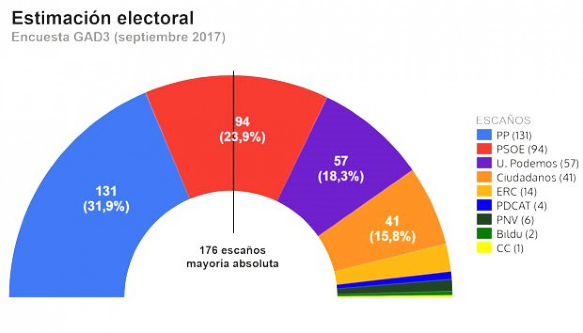 Desde la última encuesta, Rajoy ha superado una moción de censura, ha declarado como testigo en la Audiencia Nacional por el caso Gürtel y ha aprobado los Presupuestos de 2017, a lo que hay que sumar la respuesta que ha dado en la última semana al desafío independentista catalán. El resultado es que el PP sube en estimación de voto y recupera parte del terreno perdido, con un 31,9 por ciento y 131 escaños. Aún está lejos de los resultados de las elecciones de junio de 2016 (33 por ciento y 137 escaños), pero lo compensa con la subida de su socio «preferente», Ciudadanos, que se sitúa en un 15,8 por ciento y 41 escaños, nueve más que un año antes.
