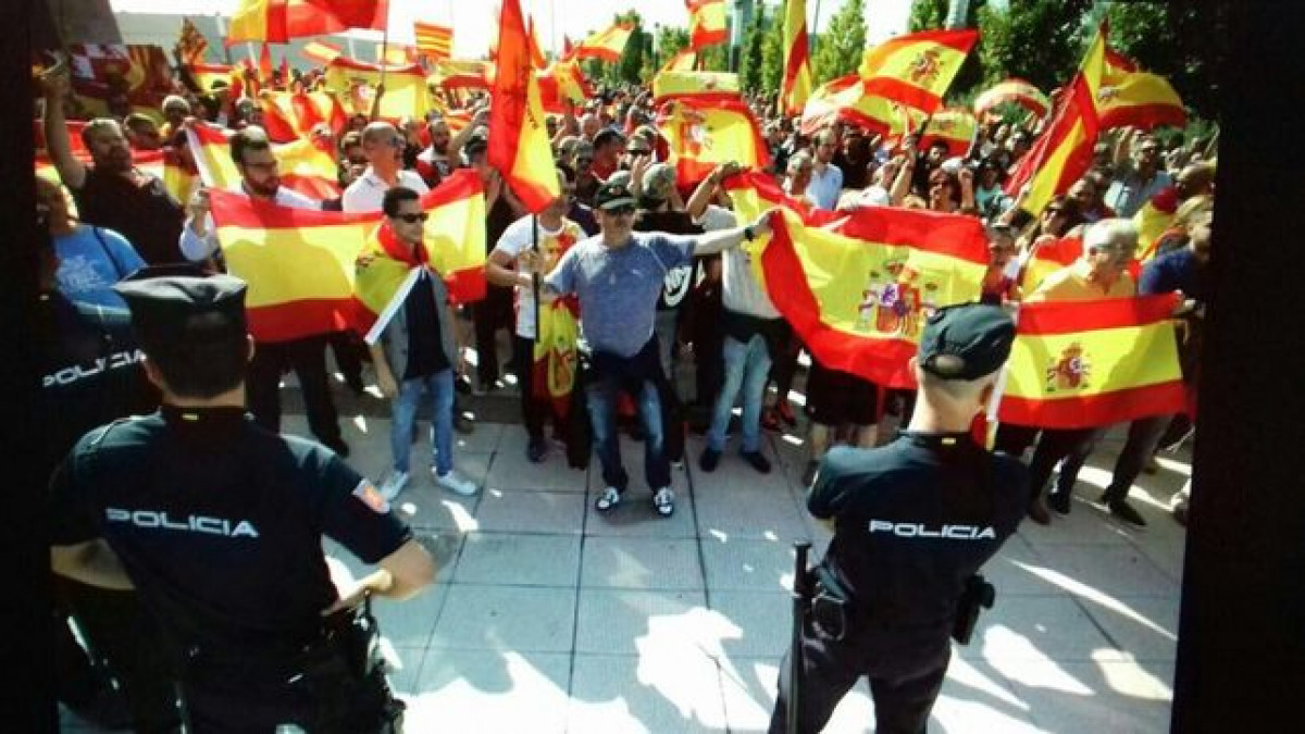 Manifestantes con banderas españolas rodean la asamblea de Unidos Podemos y agreden a la presidenta de las Cortes de Aragón