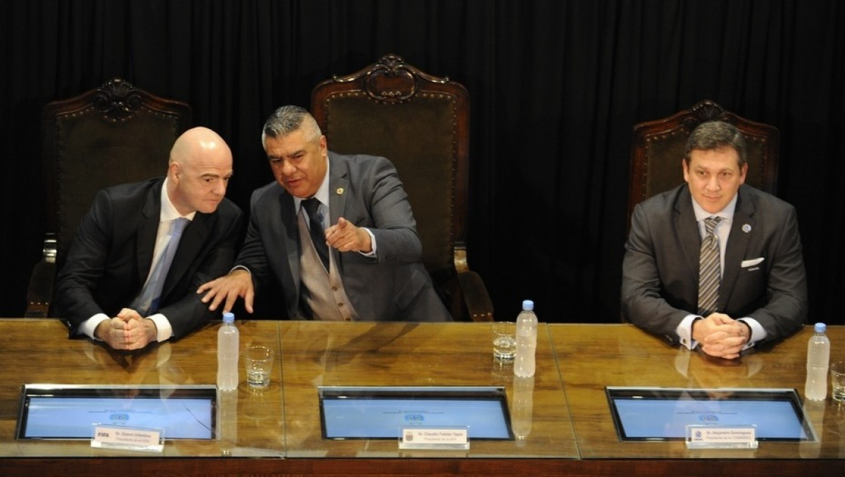 Gianni Infantino (izquierda), Alejandro Domínguez (centro) y Chiqui Tapia (Derecha).