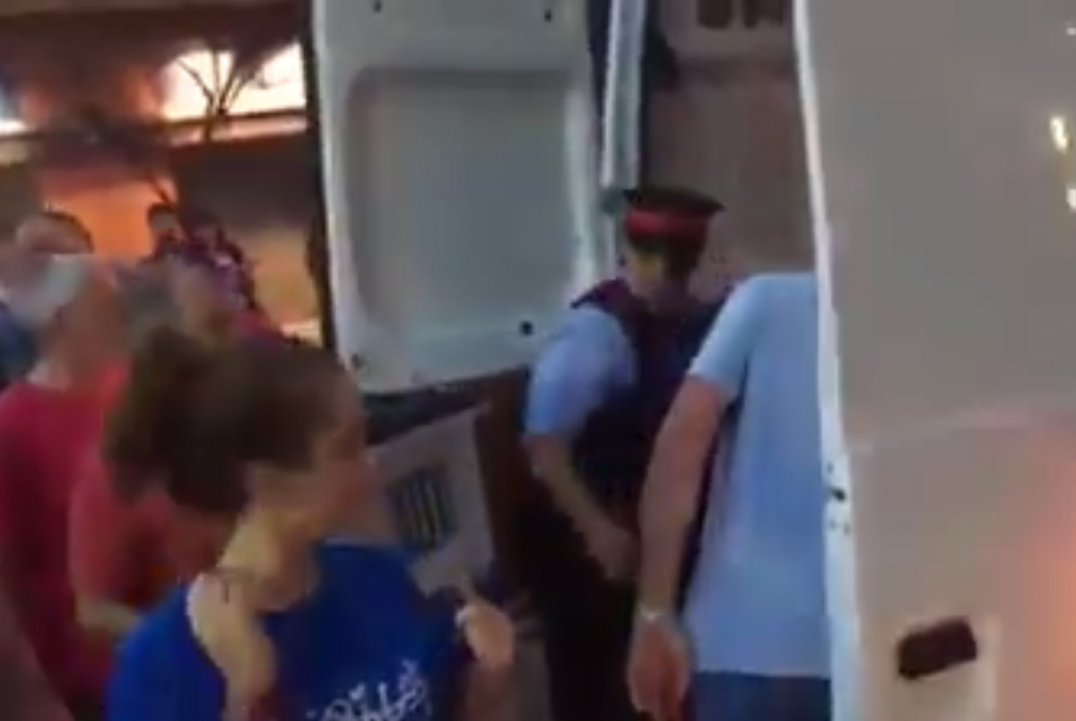 Los manifestantes en ningún momento dificultan que el agente pueda llevarse las urnas y él, cuando cierra las puertas de la furgoneta, aplaude a la gente.