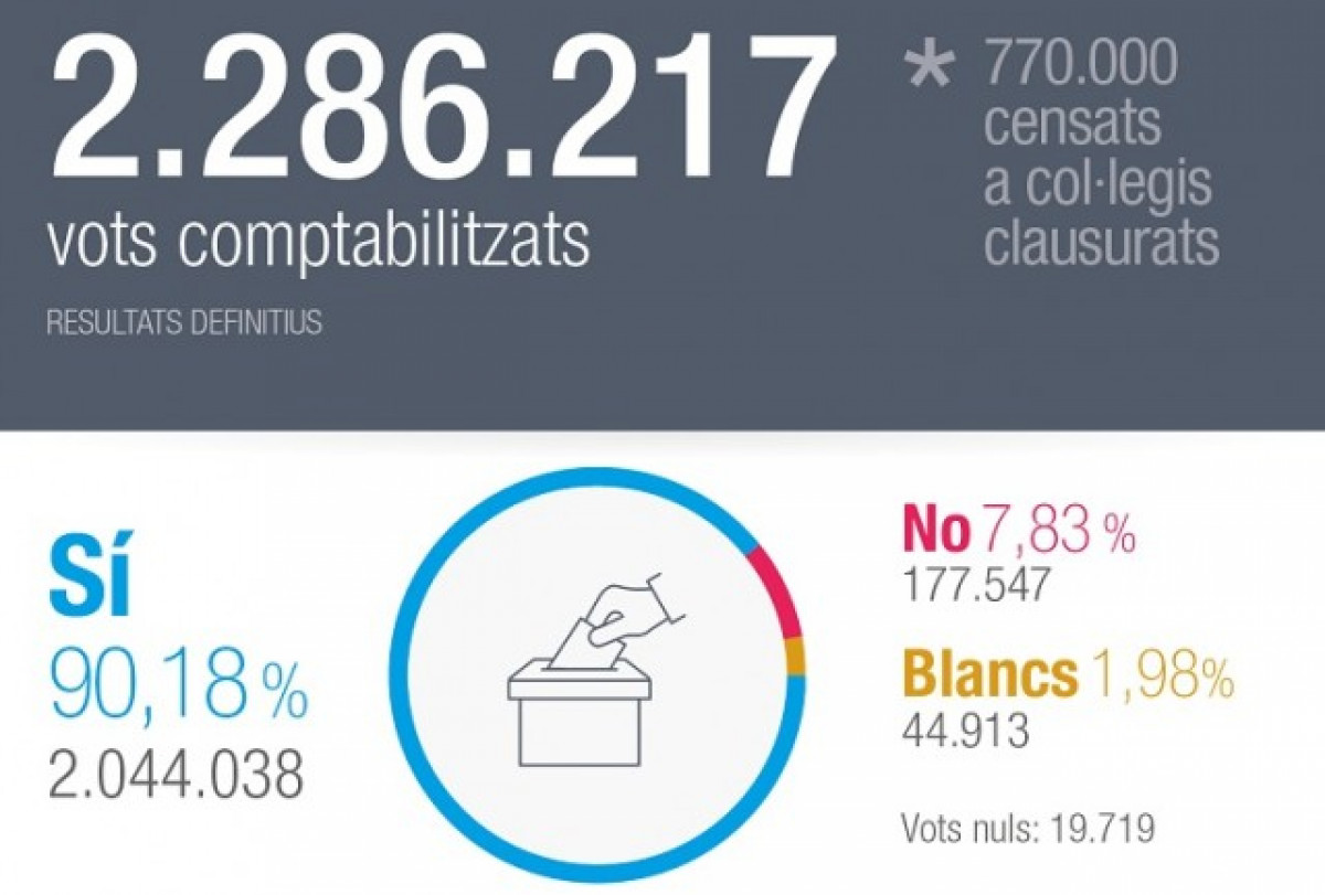 El Gobierno catalán ha anunciado este viernes su resultado definitivo del referéndum ilegal del 1 de octubre: 2.286.217 de votantes (43,03%); 2.044.038 de 'si' a la independencia (90,18%); 177.547 de 'no' (7,83%); 44.913 de votos en blanco (1,98%) y 19.719 nulos, unos resultados muy similares a los provisionalmente anunciados tras cerrarse las urnas el 1-O.