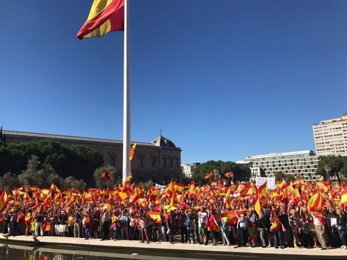 Según datos de la Delegación de Gobierno, esta concentración en ha sido secundada por 50.000 personas. Los manifestantes de todas las edades han abarrotado la Plaza de Colón con banderas españolas al cuello o en la mano y han gritado al unísono consignas como "Viva España", "Puigdemont a prisión" "No somos fachas, somos españoles", "Con golpistas no se dialoga"; al mismo tiempo que se ha cantado y bailado al ritmo de la música.
