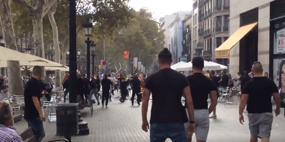 Una gran pelea ocurrida este jueves a mediodía tras la manifestación del 12-O en Barcelona ha destrozado la gran terraza del popular Bar Zurich, que se ha visto obligado a cerrar.