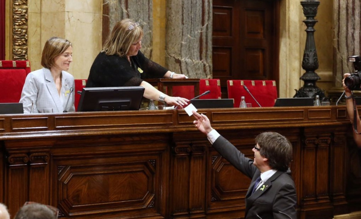 Carles Puigdemont entregando su voto a Carme Forcadell.