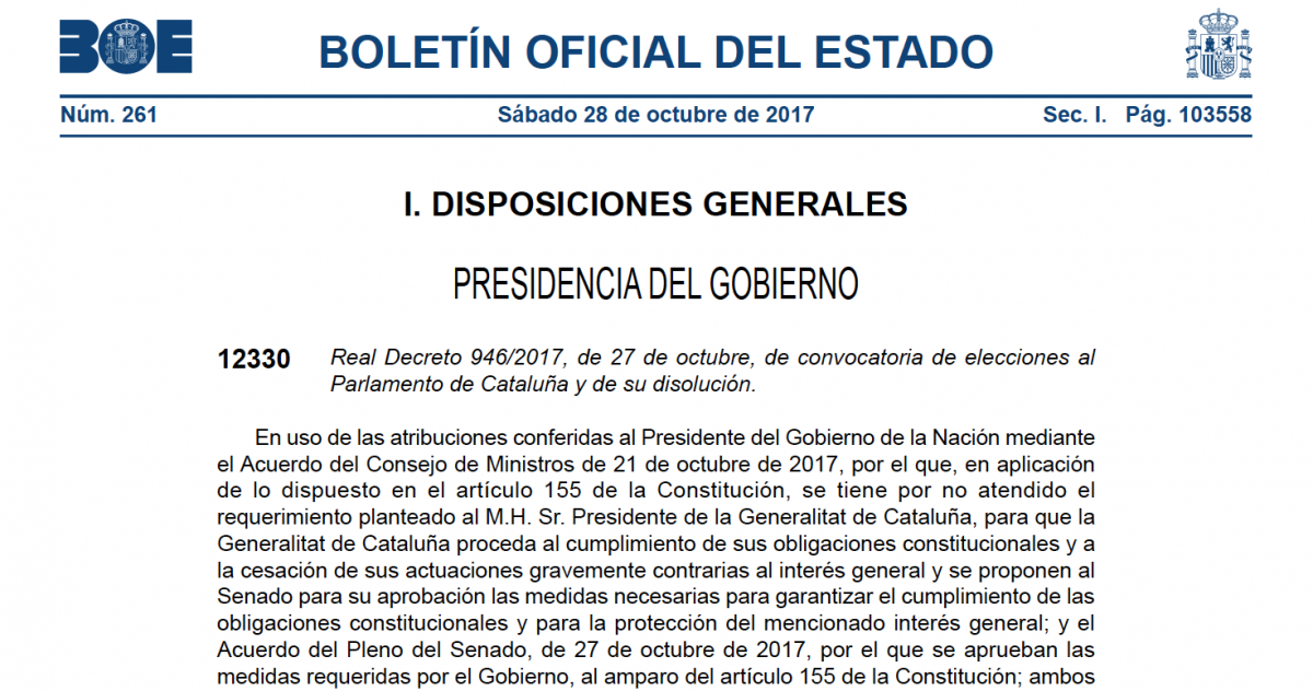 La publicación del BOE incluye, además, la disolución del Parlamento de Catalunya, elegido el 27 de diciembre de 2015 y recoge la convocatoria de elecciones previstas para el próximo 21 de diciembre. Las circunscripciones electorales de Barcelona, Girona, Lleida y Tarragona elegirán, respectivamente, a 85, 17, 15 y 18 diputados.