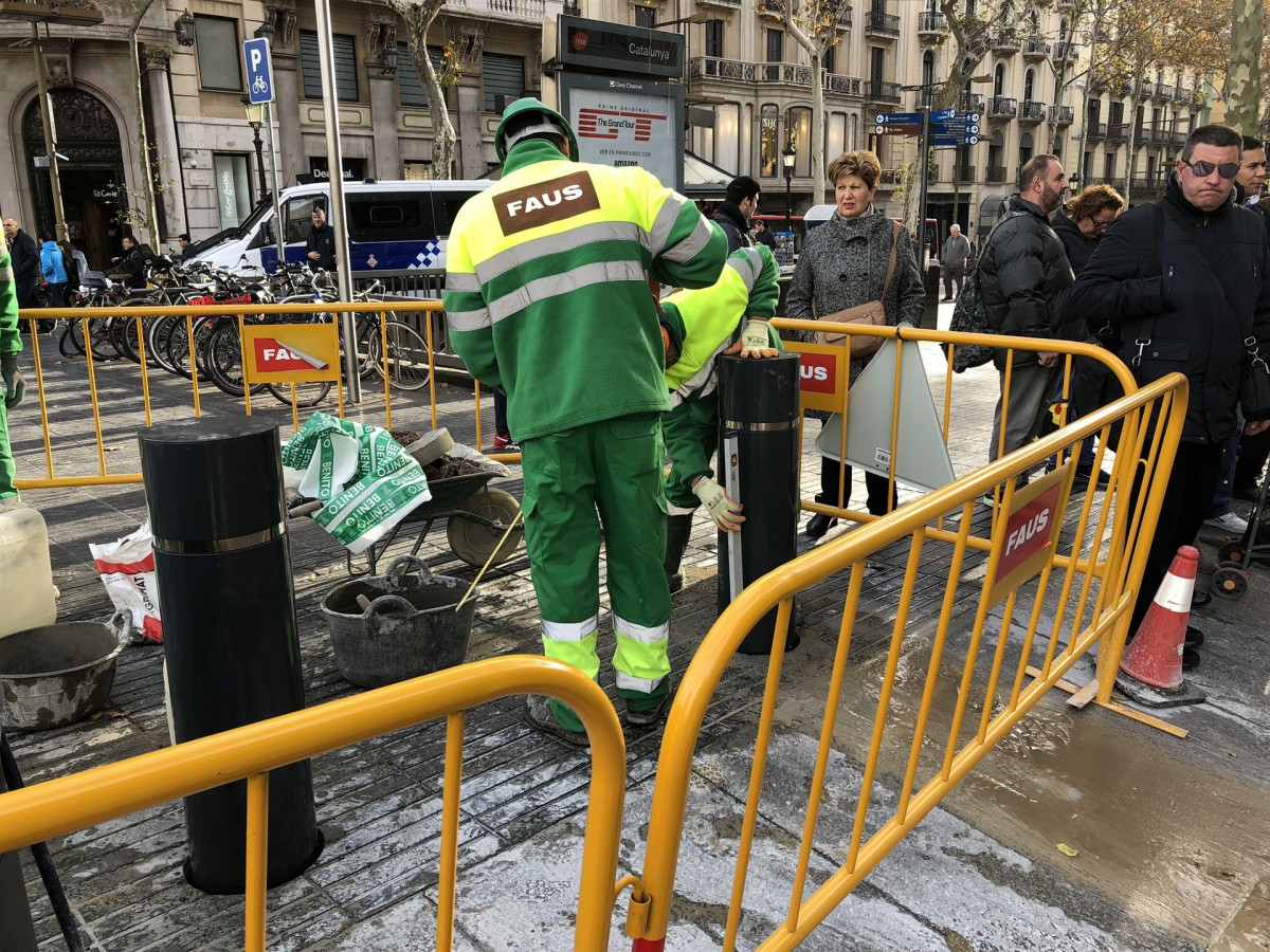 La mañana de este miércoles los operarios estaban colocando bolardos en la parte superior del paseo, la más cercana a la plaza Catalunya, por la que entró el vehículo que conducía Abouyaaqoub.