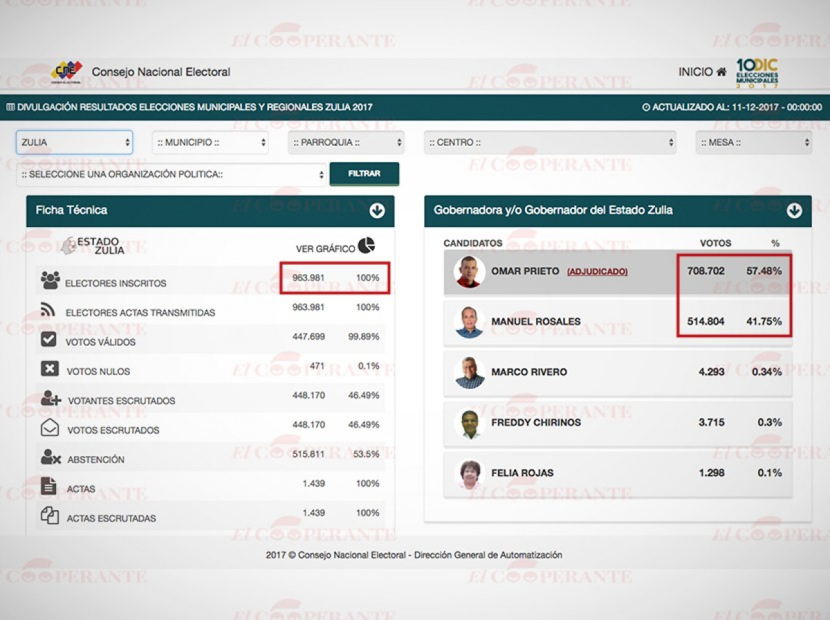 Sin embargo, una vez divulgados los escrutinios el ente comicial dejó en evidencia su error o trampa, pues informaron que el Zulia estaban habilitados para votar 963.981 personas, sin embargo, Omar Prieto y Manuel Rosales, sumaron 1.223.506 votos, es decir, 259.525 votos de más.